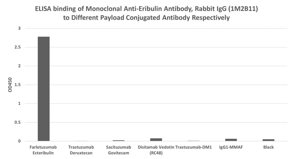 Monoclonal Anti-Eribulin Antibody, Rabbit IgG (1M2B11) (Cat. No. AB00013) is specific to Farletuzumab Ecteribulin, and has no cross-reactivity with Trastuzumab Deruxtecan, Sacituzumab Govitecam, Disitamab Vedotin (RC48), IgG1-MMAF and Trastuzumab-DM1 (Routinely tested).