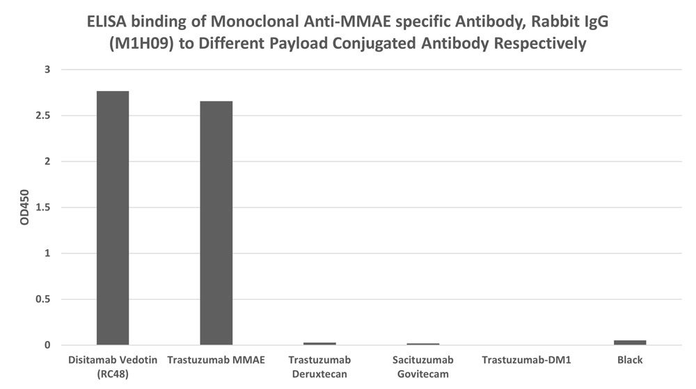 Monoclonal Anti-MMAE specific Antibody, Rabbit IgG (M1H09) (Cat. No. AB00008) is specific to Disitamab Vedotin (RC48) and Trastuzumab MMAE, and has no cross-reactivity with Trastuzumab Deruxtecan, Sacituzumab Govitecam and Trastuzumab-DM1 (Routinely tested).
