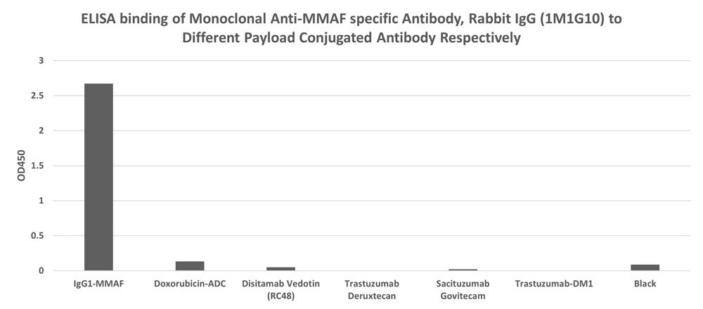 Monoclonal Anti-MMAF specific Antibody, Rabbit IgG (1M1G10) (Cat. No. AB00009) is specific to IgG1-MMAF and has no cross-reactivity with Doxorubi-cin-ADC, Disitamab Vedotin (RC48), Trastuzumab Deruxtecan, Sacituzumab Govitecam and Trastuzumab-DM1 (Routinely tested).